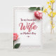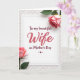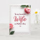 This card features a bright white rectangle centered on a soft gray, lightly patterned background, like gentle wallpaper. Two blush-pink roses with layered petals sit diagonally, one in the upper right and the other in the lower left, with green stems and leaves reaching inward as if leaning close ❤️. The flowers frame the message the way a pair of companions might, creating a quiet, affectionate scene without needing any figures. The main word “Wife” appears large in a deep berry color near the middle, with the rest of the message in smaller dark lettering arranged around it. The text sits neatly in the open white space, leaving room for the roses to “breathe” and draw your eye back to the center. A small maroon heart icon rests just below the wording, like a tiny affectionate nod 🌼. The gray background shows a subtle repeating pattern that softly borders the white card without overpowering the blush petals and berry text.