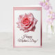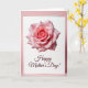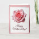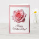 This card shows a white greeting card set at a slight angle on a soft pastel pink surface, creating a gentle, affectionate mood ❤️. Centered on the front is a large pink rose with tightly curled petals that spiral outward from a deeper rosy center to lighter blush edges, like a quiet gesture of care. Tiny water droplets cling to the petals and catch the light, adding a fresh, just-misted look that feels like a tender morning moment. The background stays simple and softly lit, keeping attention on the flower’s delicate texture and color shifts. Beneath the rose, the text “Happy Mother’s Day!” sits near the lower portion of the card in dark maroon lettering that stands out against the white. The message is placed with generous spacing, giving the design an airy, calm balance 🌼. Subtle shadows along the card’s edges help it feel grounded against the pastel pink backdrop, and the rose remains the clear focal point with glossy droplets sparkling across its upper petals.