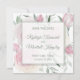 Announce your upcoming wedding date with modern elegance. The pink roses and greenery fills the background, while an overlay is centered displaying the couple's names, wedding location, and date. Behind the save the date info is a glimpse of the floral background.