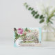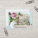 Unrolled scroll featuring a vignette of a house on a lake. Four tiny birds sit on the snow covered scroll. A pretty pink rose completes this victorian trade card from the 19th century.