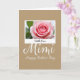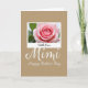 This design shows a close-up rose in soft pink tones, with petals fading from pale blush at the edges into deeper fuchsia near the tightly curled center, like a gentle kiss captured in a flower ❤️. The bloom sits inside a white, slightly weathered frame that resembles a small photo print, adding a cozy, keepsake feel. Behind it, the background is a blurred wash of leafy greens with a light, dreamy glow, suggesting a quiet garden moment. Below the framed flower, a wide band of warm taupe holds three lines of white, flowing lettering. “With Love,” appears smaller near the top of the taupe area, “Mimi” is much larger and centered as the main name, and “Happy Mother’s Day” sits beneath it in a smaller line. The soft contrast between the bright white letters and the earthy taupe makes the words easy to read while keeping the mood gentle and affectionate 🌼. The rose’s layered petals show subtle shading and texture, with the deepest color concentrated in the spiral at the center.