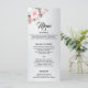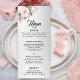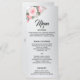 A very chic and elegant silver wedding menu (or for any other important event for that matter) which features a beautiful bunch of pink roses in the corner of the front of the card. There is a second pink rose bouquet on the back. All on a sophisticated, classy metallic silver-look background.
