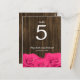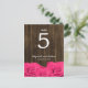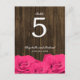 A country themed wedding table number featuring pink roses on a brown barn wood background.