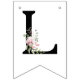 Modern party bunting banner featuring bold black letters in a classic elegant font spelling “CONGRATULATIONS.” The design is set against white and pale blush pink background that adds a romantic summer celebration feel. Clean, bold, and stylish, this party banner is ideal for graduation parties, birthdays, achievements, and all kinds of milestone celebrations. Each letter has green leaves and blush pink roses added to them.