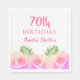 Pink Rose Floral 70th Surprise Birthday Party Napkins. Birthday floral napkins with beautiful pink roses and tropical leaves. Perfect for a woman who is celebrating her seventieth birthday. Add your name and age.