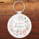 Baby Baptism/Christening keychain. This design features an illustration of floral wreath with pale pink roses and leafy green stems in watercolor style with golden effect confetti and an image of cross.