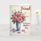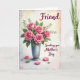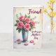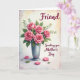 This card features a full bouquet of pink roses with softly unfurling petals, gathered in a silver-toned vase that catches a gentle shine. Deep green leaves frame the blooms, and a few loose petals and sprigs rest below as if someone just set the flowers down after a sweet visit ❤️. Behind the arrangement, a smooth pastel backdrop blends creamy yellow, blush pink, and a faint touch of lavender, giving the scene a cozy, close-to-the-heart feel. At the top, the word “Friend” appears in deep maroon lettering, centered and easy to spot. Lower on the front, “Sending you Mother’s Day” is placed beneath the vase area in matching maroon text, keeping the message balanced with the artwork. Soft lighting highlights the rose textures and the fine lines in the leaves, adding a gentle, affectionate mood like a warm hug between friends 🌼. The vase sits on a pale surface where scattered petals and leafy pieces create a small trail in front of the bouquet.