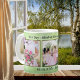 Personalized photo mug featuring your own photos framed by pink roses on an artistic green background. Lovely as a wedding or anniversary keepsake or to say Thank You to your bridesmaids.