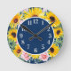 Cute and stylish boho-style yellow sunflowers and pink roses on navy blue wall clock