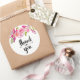 The sticker is made on wonderful paper and had no problem sticking to the bag that I purchased to put it on. I wanted to find a design that would be cute for the bride and groom and this one fit the bill as it has cute "bees" buzzing around and the wedding was taking place in a town called "Bee Cave". The packaging was great and protected the stickers. The website is easy to navigate and there are so many color choices. I had no problem finding a color that the bride was using on everything else selected. The design was adorable and there were many to choose from. You can make the figure as larger or smaller and you can place the photo and writting whereever you want to in the sticker. The printing is fabulous..better than expected.