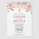 Elegant watercolor pink roses floral baby girl Baptism invitation design featuring florals in varying shades of pink to mauve with olive green leaves in a top swag type bouquet surrounding your sweet baby's details. A gold tone trinity cross sits below the floral pattern, and the back features a marbled look blush pink subtle background. This composite floral design is by Holiday Hearts Designs (rights reserved).