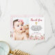 Elegant watercolor pink roses floral baby girl Baptism "Thank You" design featuring florals in varying shades of pink to mauve with olive green leaves in a bottom swag type bouquet surrounding your sweet baby's details. A gold tone trinity cross sits below the "Thank You", and the back features a marbled look blush pink subtle background with a coordinating floral swag on bottom. This composite floral design is by Holiday Hearts Designs (rights reserved).