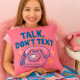 Make a statement with every snuggle. This "Talk, Don't Text" throw pillow features a glittery pink rotary phone on a vibrant pink background, adorned with sparkles and retro charm. It is an ideal accent for screen-free spaces, tween bedrooms,.