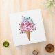 Sweet waffle cone with fresh, pink Japanese cherry blossoms on white background with blue watercolor streaks. Pink Japanese cherry.