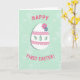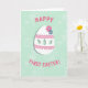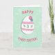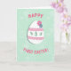 This card features a large white egg shape centered on a soft mint-green background, trimmed with gentle pink accents that feel sweet and friendly 🌷. Two thin pink bands wrap around the egg, each finished with a scalloped edge that adds a soft, lacy texture without looking fussy. Three almond-shaped cutouts run across the middle, letting the green background peek through like little windows. At the top curve, two small flowers—one hot pink and one calm blue—sit close together, like a tender pair leaning in. The background has faint, leafy patterns that curl and overlap, giving the scene a cozy, springtime setting 🐇. In hot-pink, all-caps lettering, “HAPPY” curves above the egg, while “FIRST EASTER!” sits along the bottom in the same bright color. A light shadow beneath the egg makes it look slightly lifted from the mint-green surface with its subtle foliage-like texture.