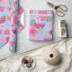 This wrapping paper has a Scandinavian design of flowers and leaves in various shades of pink and green on a field of blue.
