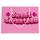 A pink gift bag with the words "Sweet Seventeen" in a stylized font. The background of the bag features a pattern of alternating pink stripes and pink squares. The words "Sweet Seventeen" are written in a large, cartoonish font with a white outline and a pink fill. There are two pink hearts, one on either side of the words. The bag has white handles.