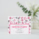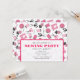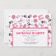 A sewing party invitation featuring illustrations of spools of thread, sewing machine, pin cushion, scissors, fabric swatches, and sewing needles. Design has a pink color scheme. Personalize the text on front with details of your occasion.