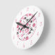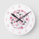 A clock featuring a pink sewing themed design consisting of illustrations of pin cushions, sewing machines, sewing needles, fabric swatches, scissors, and spools of thread.