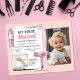 Set against a backdrop of lively blush pink, whimsical illustrations adorn the border, featuring essential tools of the trade: a hairspray bottle, scissors, comb, and blow dryer. The design exudes a sense of celebration and excitement, perfectly complementing the memorable occasion.