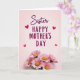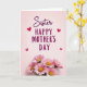 This card features a soft pink background with a gentle, romantic feel, like a quiet hug shared between close family ❤️. Across the top, the text reads “Sister HAPPY MOTHER’S DAY,” with “Sister” in deep magenta cursive and the rest in a darker, simple all-caps style. The message sits centered near the upper portion, leaving airy space around it so the words feel calm and caring. Four small red heart icons are sprinkled near the lettering, adding little sparks of affection without crowding the design. Near the bottom, five daisy-like flowers spread in a loose cluster, their petals shaded in blush pink with warm yellow centers. The petals have soft highlights and faint texture, giving them a fresh, just-picked look 🌼. The overall lighting is even and diffused, and the lower third is anchored by the blossoms while the hearts hover lightly around the top text.