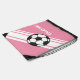 This design features a soccer ball and white stripes against a pink background. Personalize this drawstring backpack with a name. This bag is great for holding a soccer ball, shoes and other sports accessories. This cinch sack also makes a great gift for soccer players.