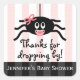 An adorable spider wearing a pink bow and sucking on a pink pacifier hangs from the top of a pink and white striped background. these pink and black stickers and labels make cute halloween baby shower party favor labels. Artwork © Chrissy H. Studios, LLC. All Rights Reserved.