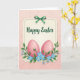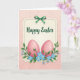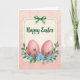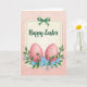 This greeting card features a cream border with rounded corners framing a soft pastel pink background, lightly patterned with tiny floral and star-like shapes 🌷. Near the top center, the words “Happy Easter” sit prominently in flowing emerald green lettering, drawing the eye first. Beneath the text are two large blush-pink egg shapes, gently shaded to look softly lit, each decorated with small starburst accents. The eggs rest close together, nestled in a thick ring of green leaves and clusters of small sky-blue flowers, as if they’re being carefully cradled like close friends 🐰. At the very top edge of the frame, a neatly tied green ribbon bow adds a gift-like touch and subtly mirrors the green text below. The foliage curves inward around the eggs, creating a cozy, affectionate sense of togetherness through the way the shapes lean toward the center. The bow is centered above the frame, with two short ribbon tails pointing down toward the eggs.