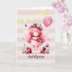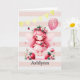 A pink fairy 5th birthday card, which can be personalized with her name and age. Features pink, gold and a strawberry fairy girl with a pink balloon on the front. The inside card message can be also personalized if wanted. A personalized fairy birthday card keepsake for daughter, goddaughter, granddaughter, etc.