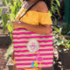 Feel the tropical breezes with this cute beach bag tote which can be personalized with any initial and name or names for a great gift. Coordinates with the Pink Striped Flamingo Monogrammed Beach Towel.