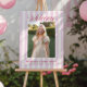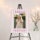 The sign features soft pink stripes that create a serene and inviting backdrop, exuding a sense of timeless elegance. The gentle hues provide a perfect canvas for the berry-colored font, adding a touch of vibrancy and sophistication to your announcement. All colors can be changed to suit your personal style or event theme, allowing for a truly customized experience.