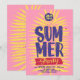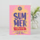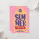 A grunge-style invitation to a summer party showing a pink backdrop with a palm-leaf overlay. The card is easy to customize with your wording, font and font color. Not exactly what you're looking for? All our products can be custom designed to meet your needs at no extra charge. Simply contact us at askpixieprints@aol.com. Coordinating products available at your request at no additional charge.