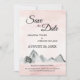 This Pink Sunrise Mountain wedding save the date brings a classy and unique, yet simple and casual touch to your wedding. The sunrise and sunset shades of pink, mauve, peach, blush, coral and dusty rose, kissed with starry gold glitter around the styled calligraphy text brings a peaceful, minimal nature to the watercolor painted grey mountains for a mountain themed marriage celebration.