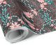 Wrapping paper with an elegant pattern made with pink flowers, teal leaves, and red berries on a dark background.
