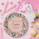Elegant botanical pink and teal watercolor floral and leaves garden-theme graduation party paper plates for girls customized with her name, school name, and graduation year.