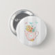 A button with a whimsical illustration. A pink teapot with a little pink heart in the center and a bouquet of flowers inside. Delicate pastel colored butterflies fluttering about. Set on a gray and white striped background.