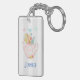 Personalized acrylic keychain with a whimsical illustration. A pink teapot with a little pink heart in the center and a bouquet of flowers inside. Delicate pastel colored butterflies fluttering about. Set on a gray and white striped background.