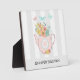 A photo plaque personalized with a name.With a whimsical illustration. A pink teapot with a little pink heart in the center and a bouquet of flowers inside. Delicate pastel colored butterflies fluttering about. Set on a gray and white striped background.