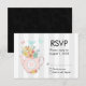 An RSVP card with a whimsical illustration. A pink teapot with a little pink heart in the center and a bouquet of flowers inside. Delicate pastel colored butterflies fluttering about. Set on a gray and white striped background.