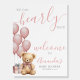 This adorable sign features the playful phrase "We can BEARly wait!" at the top in a mix of fun script and serif fonts. To the left, a large watercolor teddy bear holds balloons, adding a charming touch. At the bottom, "Welcome to" is followed by the mom-to-be’s name and the baby shower date in elegant typography. The design combines gray text with pink script calligraphy and can be customized with your preferred background color. This sweet sign adds a delightful and welcoming touch to your baby shower, perfect for any season. Sweet Script Calligraphy Watercolor Bear and Balloons Baby Shower Welcome Sign.
