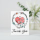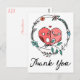 This fun floral postcard features a pair of pink cartoon lovebirds sitting inside of a love wreath with pink and blue flowers highlighted against a crisp white background. A thank you greeting is printed in a black handwritten style font for a personal feel.