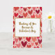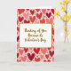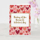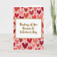This greeting card centers on a white rectangular panel with a textured gold border that stands out against the background. Inside the panel, the message reads “Thinking of You Because its Valentine’s Day” in flowing gold script with a light glitter look. The text sits right in the middle, making it the first thing you notice. Behind it, the whole card is filled with hearts scattered across a soft pink background. The hearts come in shades of red, deep crimson, and coral pink, and many have a speckled or slightly worn texture that feels handmade. Altogether, the setting feels warm and romantic, with the gold accents adding a sweet touch ❤️