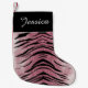 Unique pink gradient and black striped designer Christmas stocking with a custom animal print pattern. Black area at the top of the sock contains a white name in cursive font that can be personalized. This festive holiday home decor is great for her, for teen, for kids or for mom.