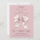 A pink toile ribbon or bow girl baby shower invitation featuring a pretty floral patterned bow illustration. The gentle toile pattern gives the bunny a delicate nursery inspired look while the clean rose pink background keeps the design elegant and modern. Centered artwork creates a charming focal point that feels warm, soft, and welcoming for a baby girl celebration. Perfect for a bunny themed baby shower, rabbit themed baby shower, or classic nursery inspired gathering. The simple layout keeps the event details easy to read while allowing the illustrated bunny to remain the heart of the design. Available in print, as a digital download or both.