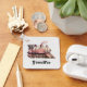A pink cute and whimsical train engine. Puffs of pink smoke coming out of its smokestack.