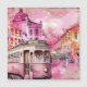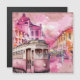 Pink trolly car artsy cityscape illustration.