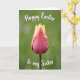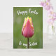 This card features a tall, centered view of a single closed tulip on a slim green stem, like a quiet spring gift meant for someone close 🌷. The petals are deep pink with a gentle fade into golden yellow at the tips, giving the flower a soft glow that feels like a tender nod between friends. Fine vertical lines on the petals add texture, as if the bloom is holding a private message just for the reader. Behind it, the background is a heavily blurred field of green tones that keeps all attention on the flower. Near the top, “Happy Easter” appears in white, flowing lettering that arches lightly above the bloom. Near the bottom, “to my Sister” is written in the same white lettering, balanced beneath the stem for a sweet, affectionate touch 🐰. The tulip sits sharply in focus against the smooth green backdrop, with the white words framing it above and below.