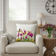 This throw pillow features a pretty spring flower design on a white background.. Use this pillow throughout the spring season. The pink tulips and yellow flowers with a butterfly will add coziness to the decor of your home.