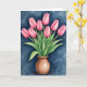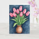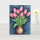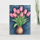 This design shows a still-life scene featuring eight pink, tulip-like flowers gathered into a full bouquet, their petals softly shaded so they look gently lit from within. The blooms rise from a simple vase in an earthy clay tone, centered on the card like a quiet offering ❤️. Green stems and long leaves curl and overlap, leaning toward one another as if in a small, affectionate huddle that suggests closeness and care. Behind them, a deep indigo background with faint texture keeps the focus on the flowers, making the pinks and greens stand out. Any greeting text sits near the top in small, light-colored lettering, with a shorter line near the bottom in a matching tone to balance the layout 🌼. Highlights trace the rounded vase and the edges of the petals, adding depth through light and shadow without crowding the composition. The final detail is the dark blue backdrop, mottled with subtle brush-like variations around the bouquet.