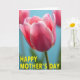 This card features a close-up photo of a single pink flower in the foreground, its petals opening gently like an affectionate embrace ❤️. Soft light glides across the petal edges, revealing fine lines and smooth curves that feel tender and intimate. Rich fuchsia tones fade into lighter blush shades, giving the bloom a romantic softness without needing any extra decoration. Behind it, a calm sky-blue background is softly blurred, with faint hints of other pink flowers that sit far back like quiet companions. The main flower is placed slightly off-center, drawing your eye into the layered folds and delicate contours. Along the bottom edge, the message “HAPPY MOTHER’S DAY” appears in bright yellow, set in clear uppercase letters that stand out against the cooler backdrop 🌼. The petals show subtle veining and gentle ripples, while the distant blossoms remain hazy and out of focus.